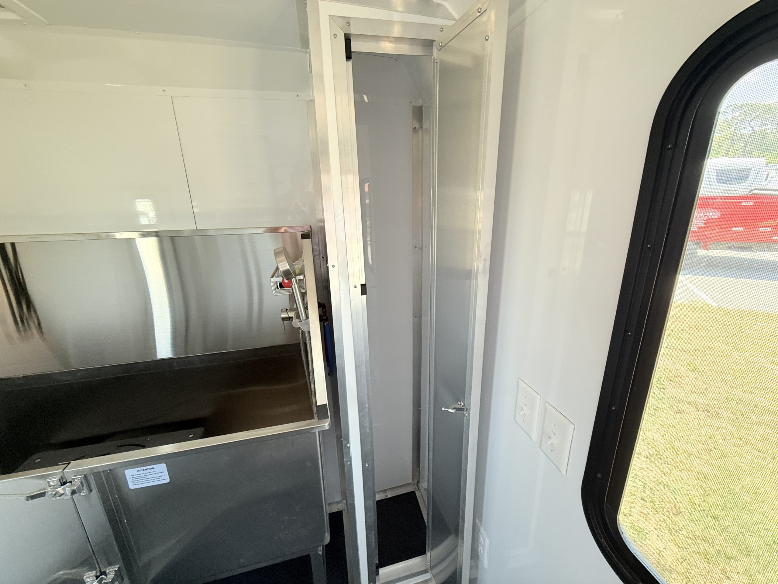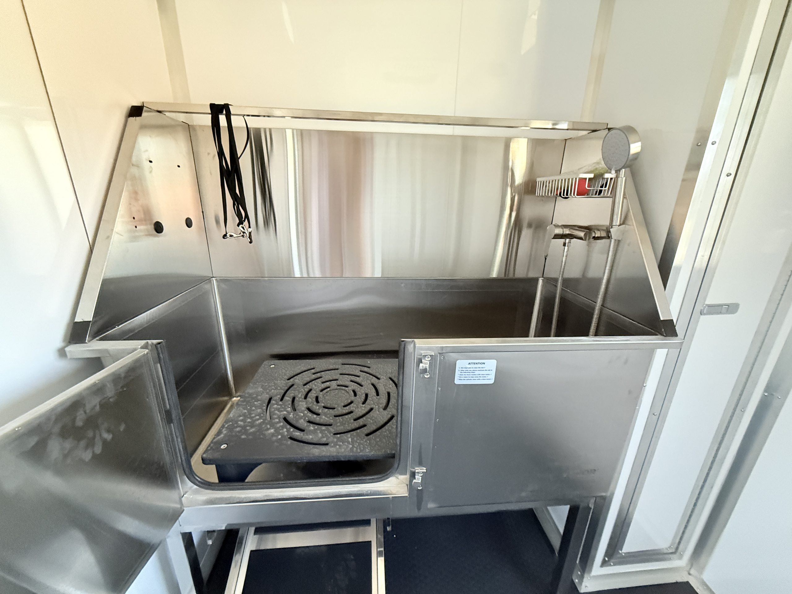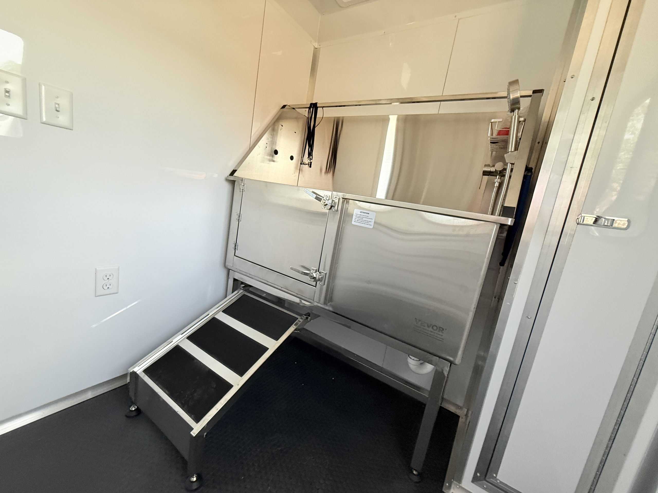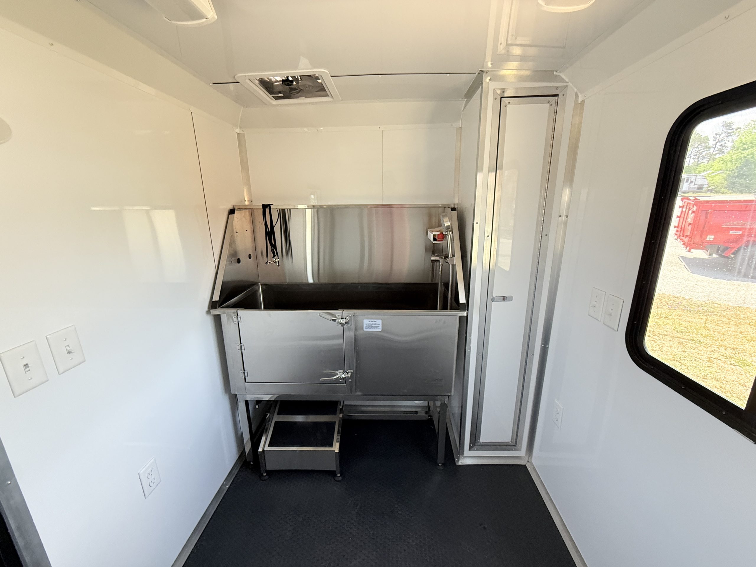 Inside, the trailer is built with comfort and efficiency in mind. The insulated walls and insulated ceiling help regulate interior temperatures, making it easier to keep pets comfortable in both hot and cold weather. Bright white metal interior walls create a clean, sanitary workspace and are easy to wipe down and maintain after each grooming appointment. The durable coin flooring offers excellent traction for pets and groomers while making cleanup simple and fast.