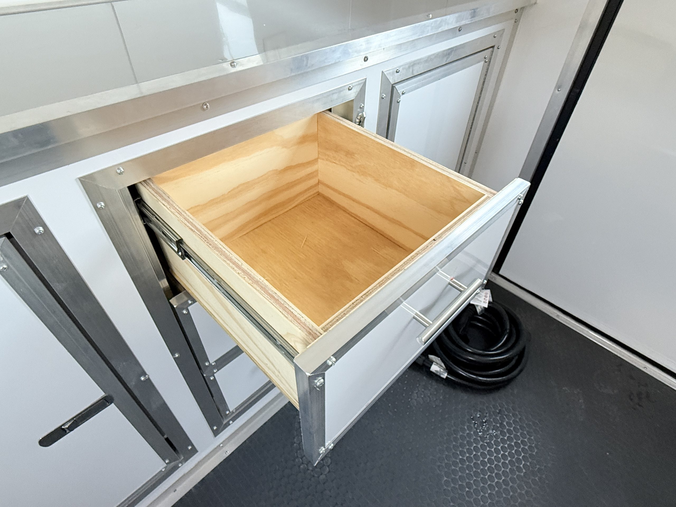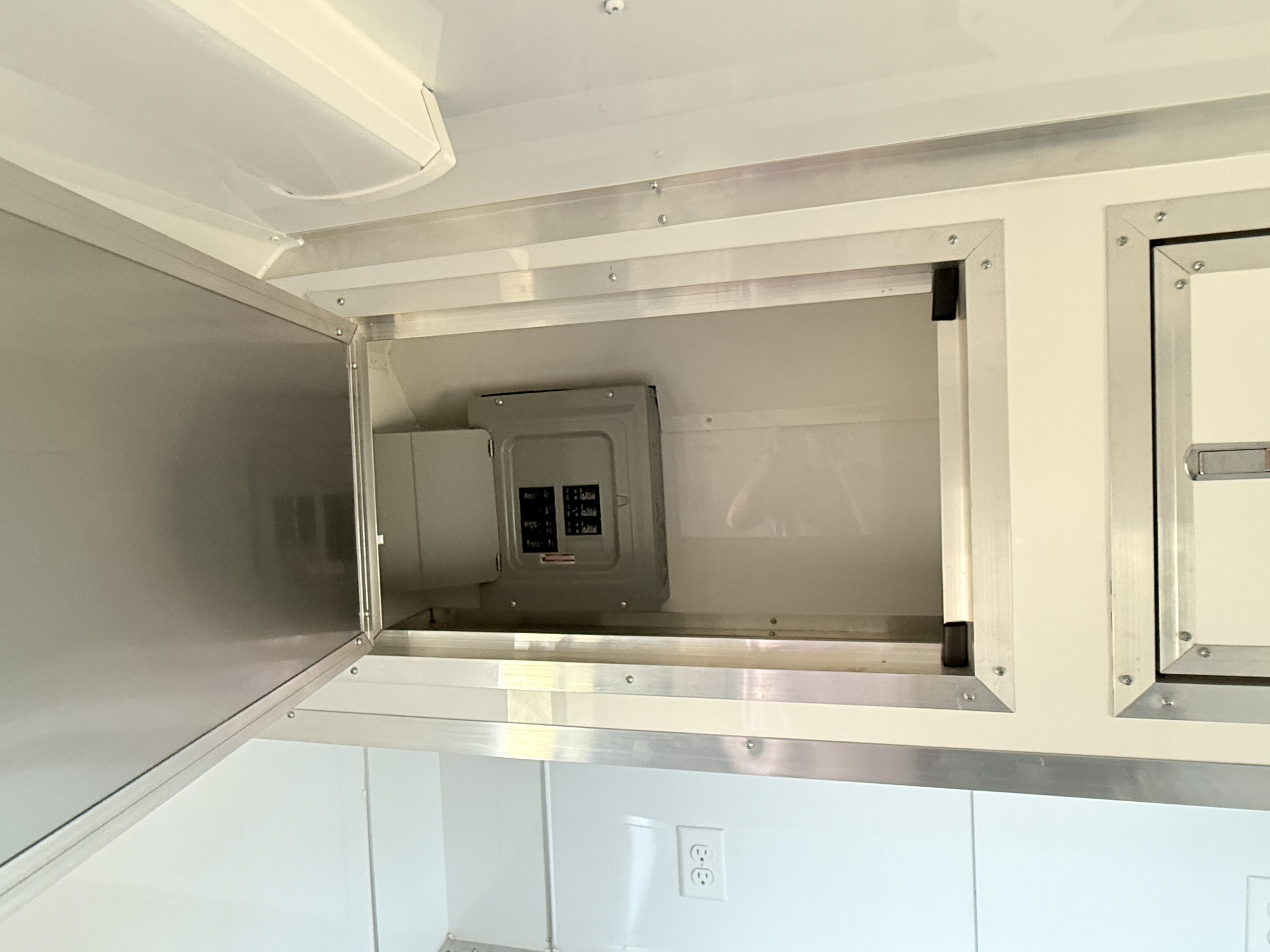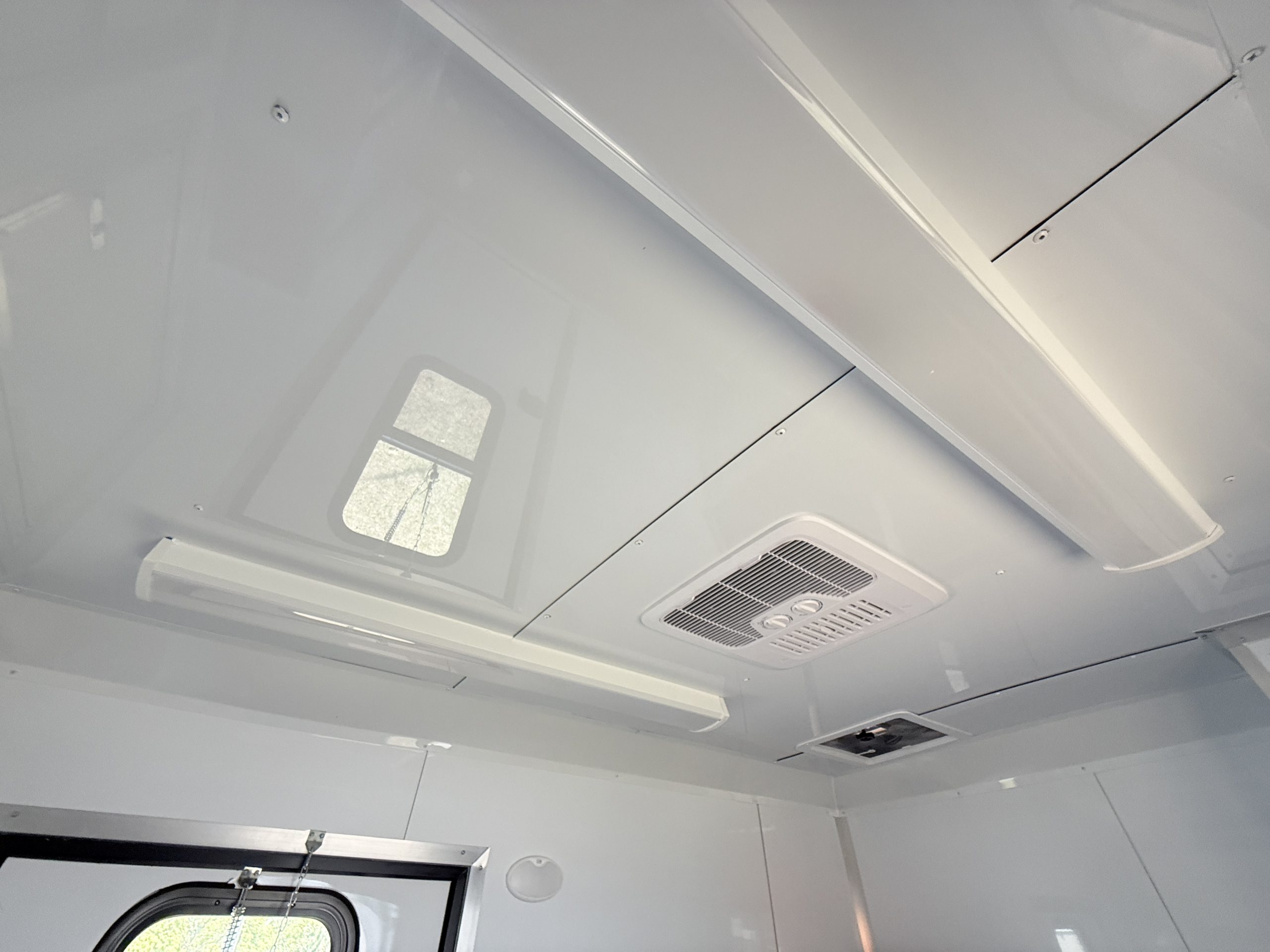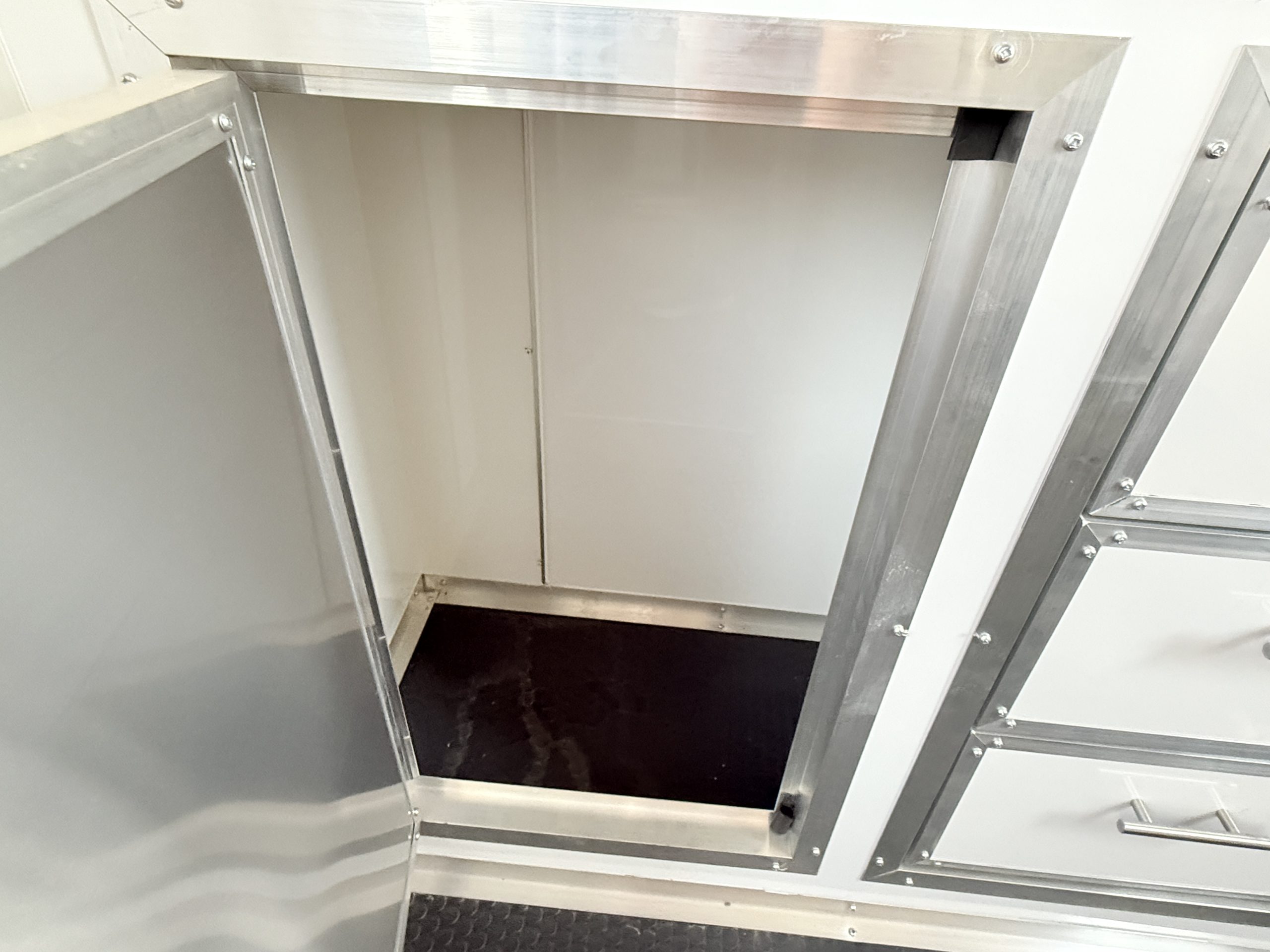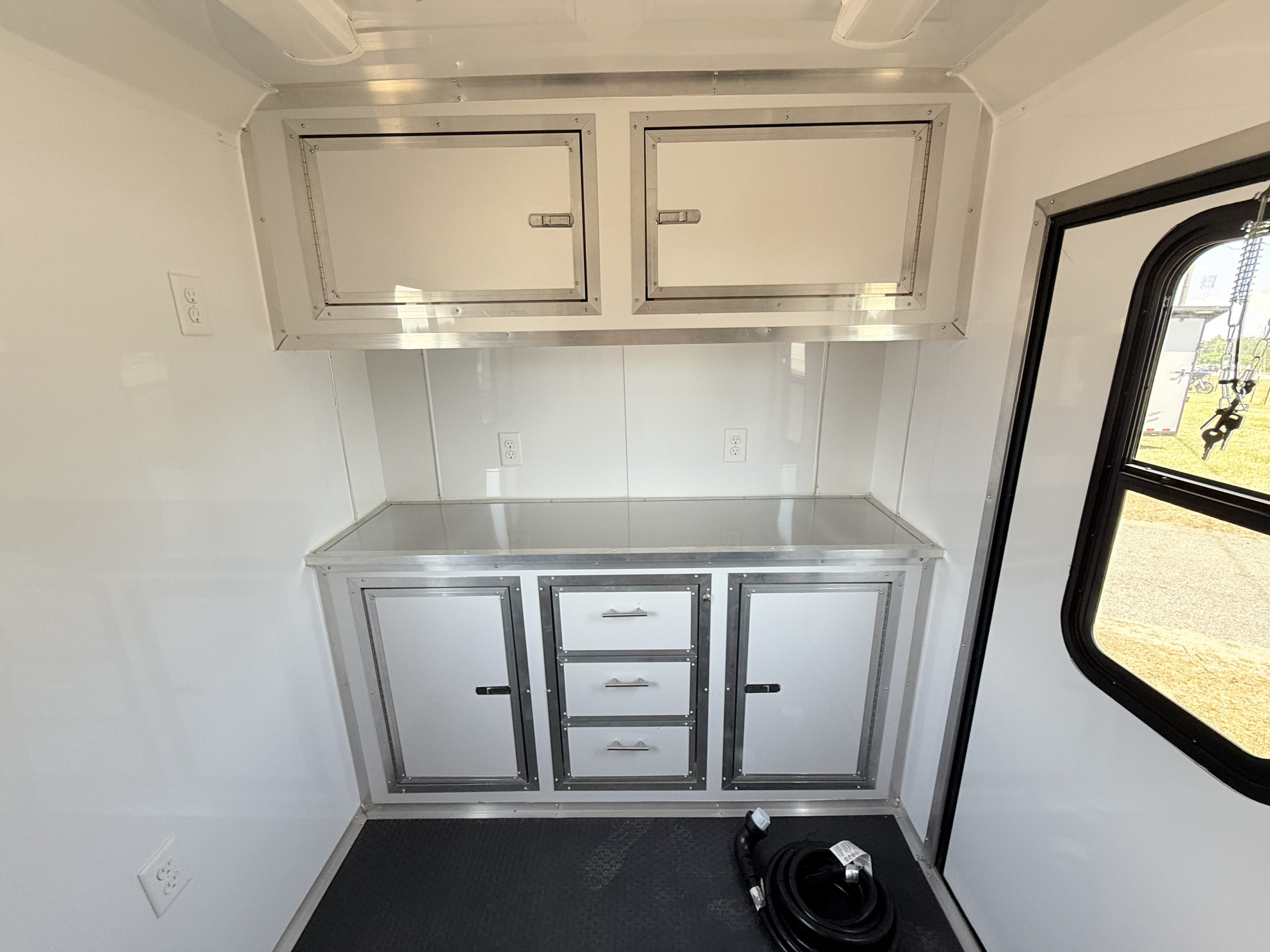 Inside, the trailer is built with comfort and efficiency in mind. The insulated walls and insulated ceiling help regulate interior temperatures, making it easier to keep pets comfortable in both hot and cold weather. Bright white metal interior walls create a clean, sanitary workspace and are easy to wipe down and maintain after each grooming appointment. The durable coin flooring offers excellent traction for pets and groomers while making cleanup simple and fast.